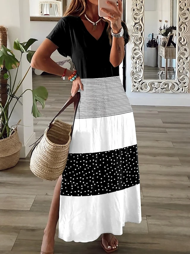 Women’s Casual Dress A Line Dress Floral Dress Polka Dot Color Block Split Print V Neck Long Dress Maxi Dress Fashion Streetwear Outdoor Daily Short Sleeve Regular Fit Black Light Green Blue Summer
