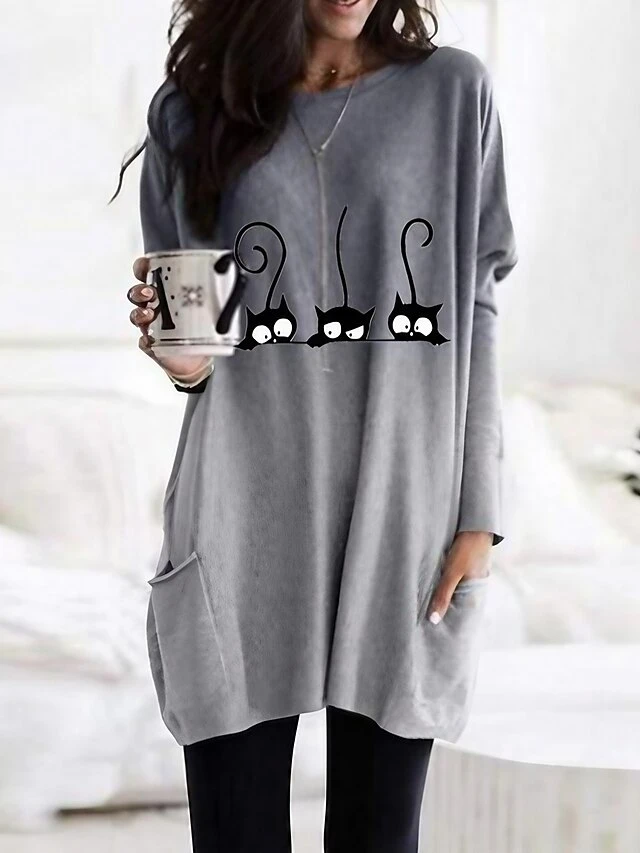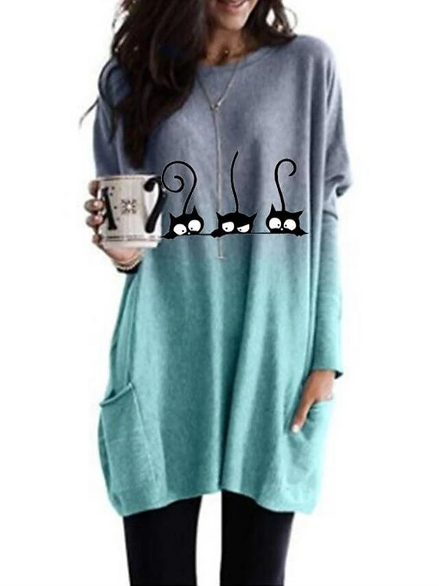 Women’s T Shirt Dress Tee Dress Knee Length Dress Pink Blue Purple Long Sleeve Cat Patchwork Spring Fall Crew Neck Casual Winter Dress Fall Dress Loose Fit 2023 S M L XL XXL 3XL 4XL 5XL
